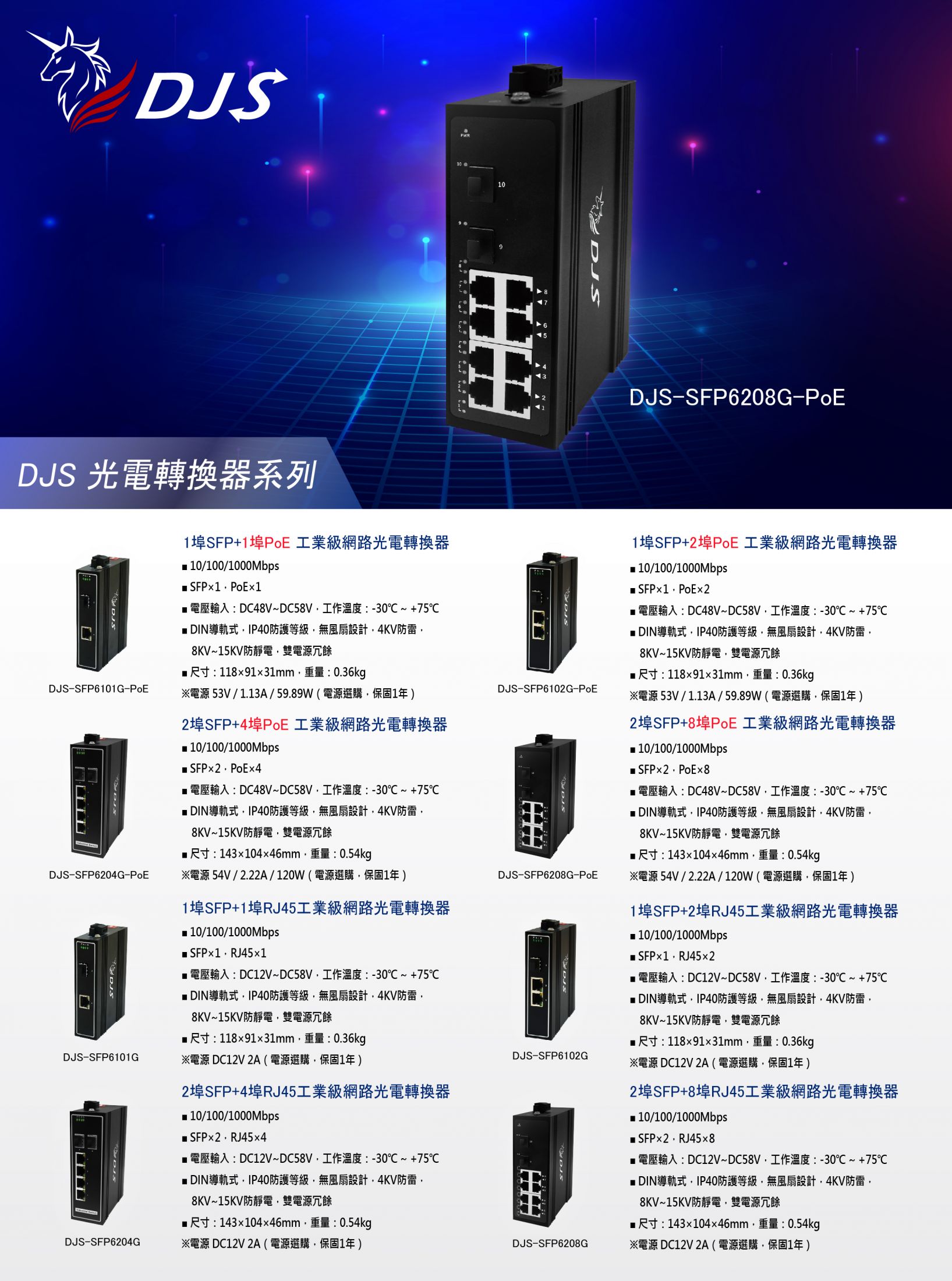 DJS-SFP6204G工業級網路光電轉換器採用儲存轉發,DIN 導軌安裝,無風扇,低功耗,雙直流電源輸入,寬溫度和寬電壓設計,並通過嚴格的工業標準測試,具防雷和防靜電保護,IP40 防護等級,適合運用在工廠或高溫嚴酷的環境,可廣泛應用於交通、電信、監控、海運、航空、製造…等工業領域之機關單位。