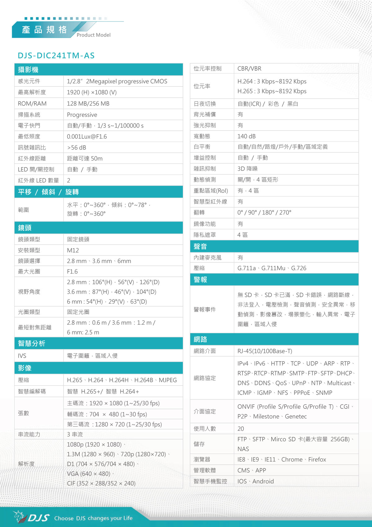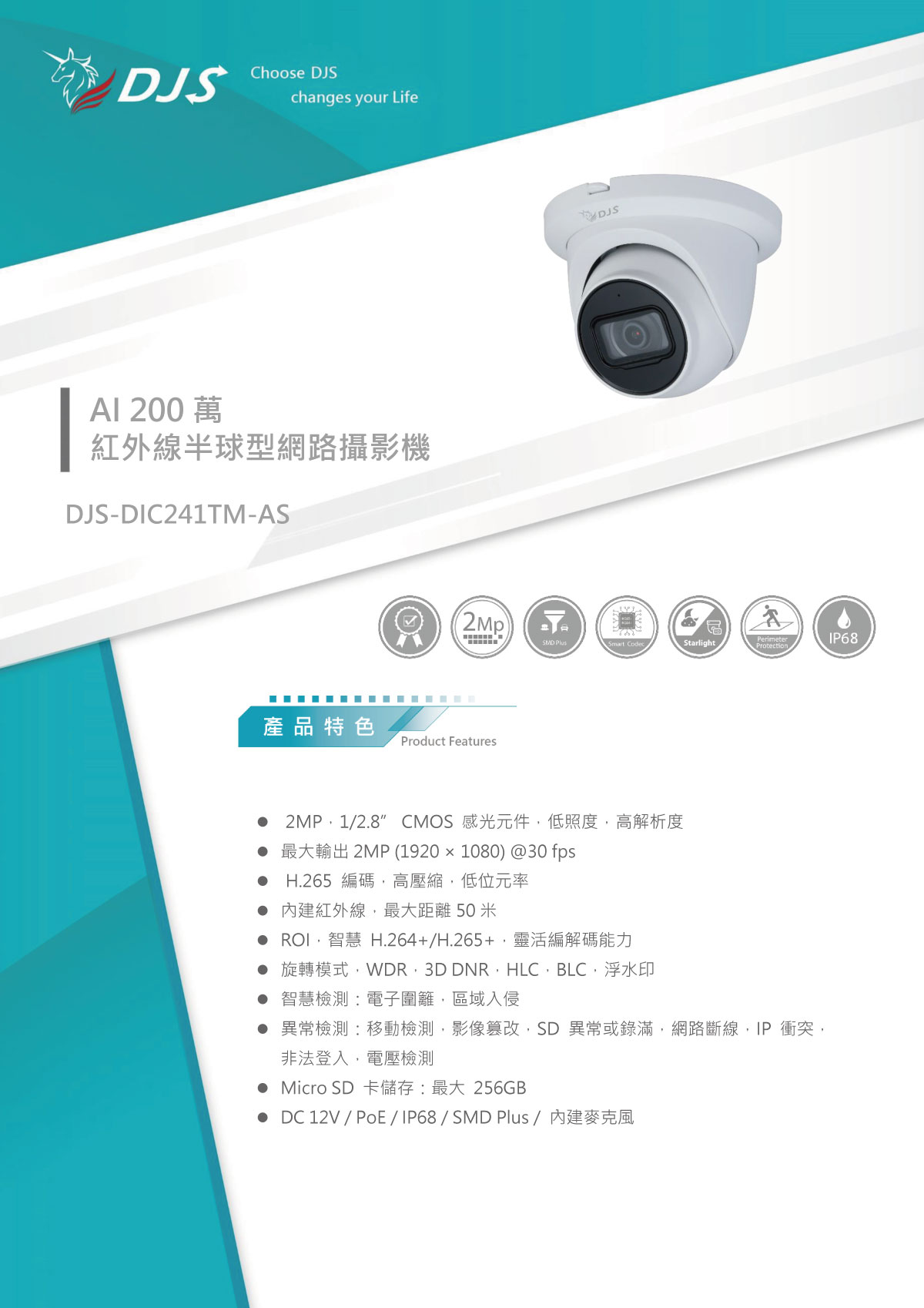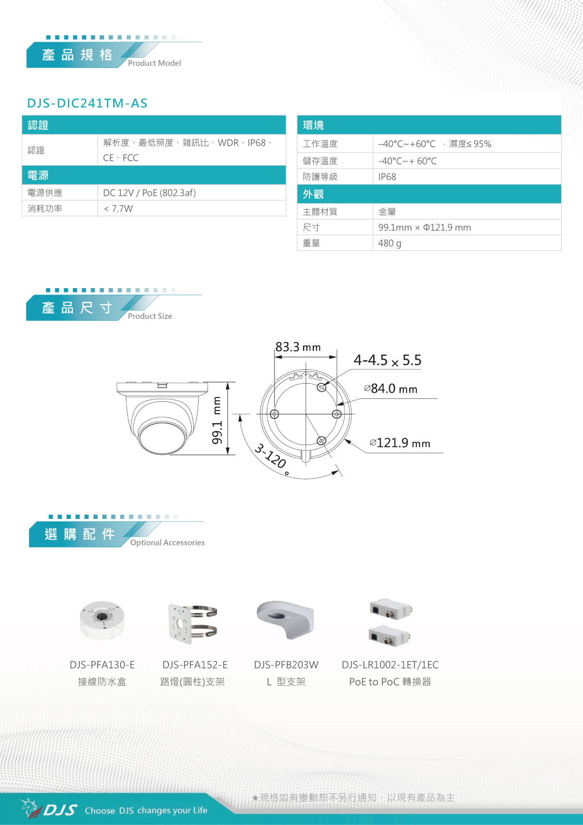 解析度、最低照度、雜訊比、WDR、IP68、 CE、FCC |