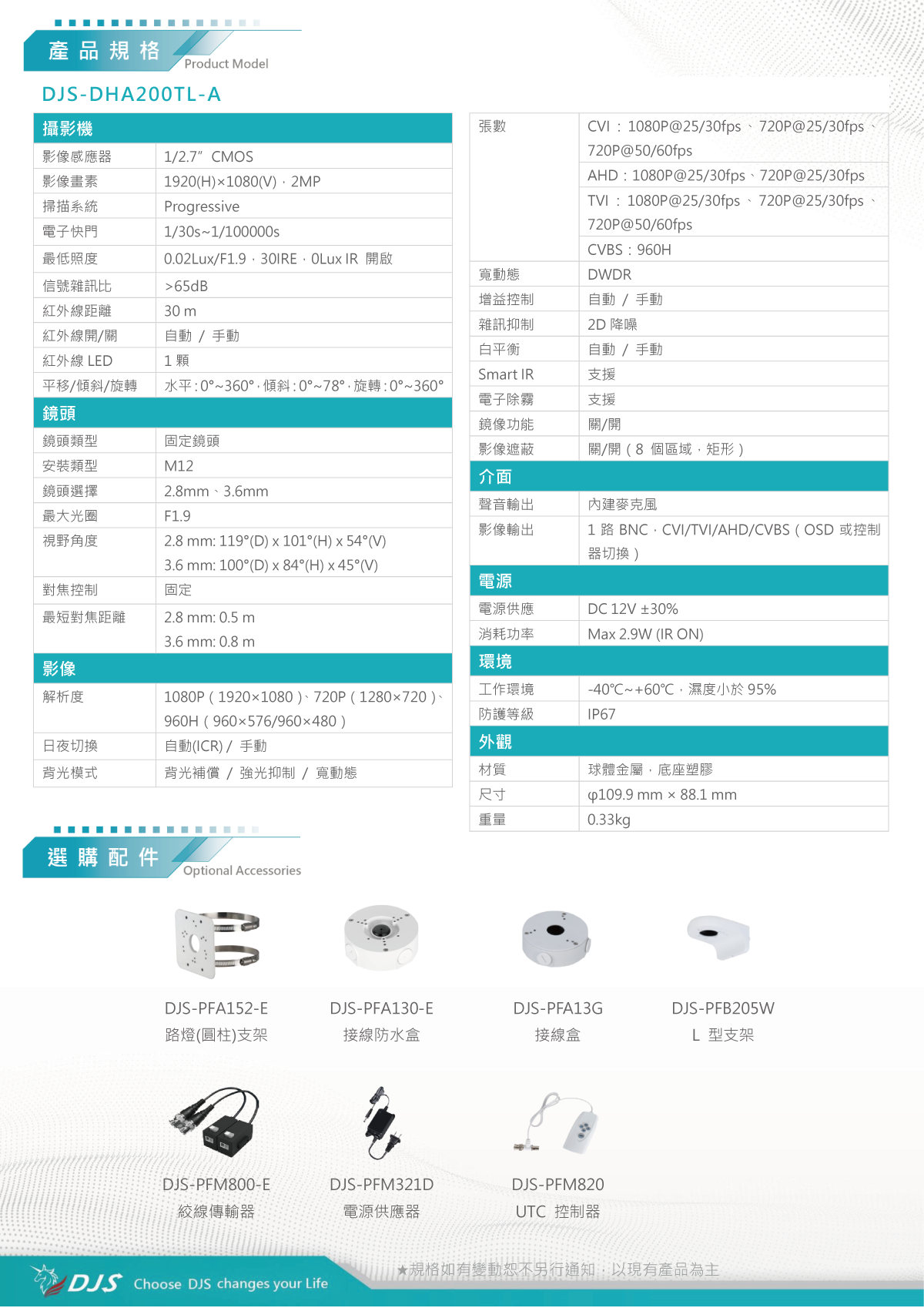 | 鏡頭選擇 | 2.8mm 、 3.6mm | |||