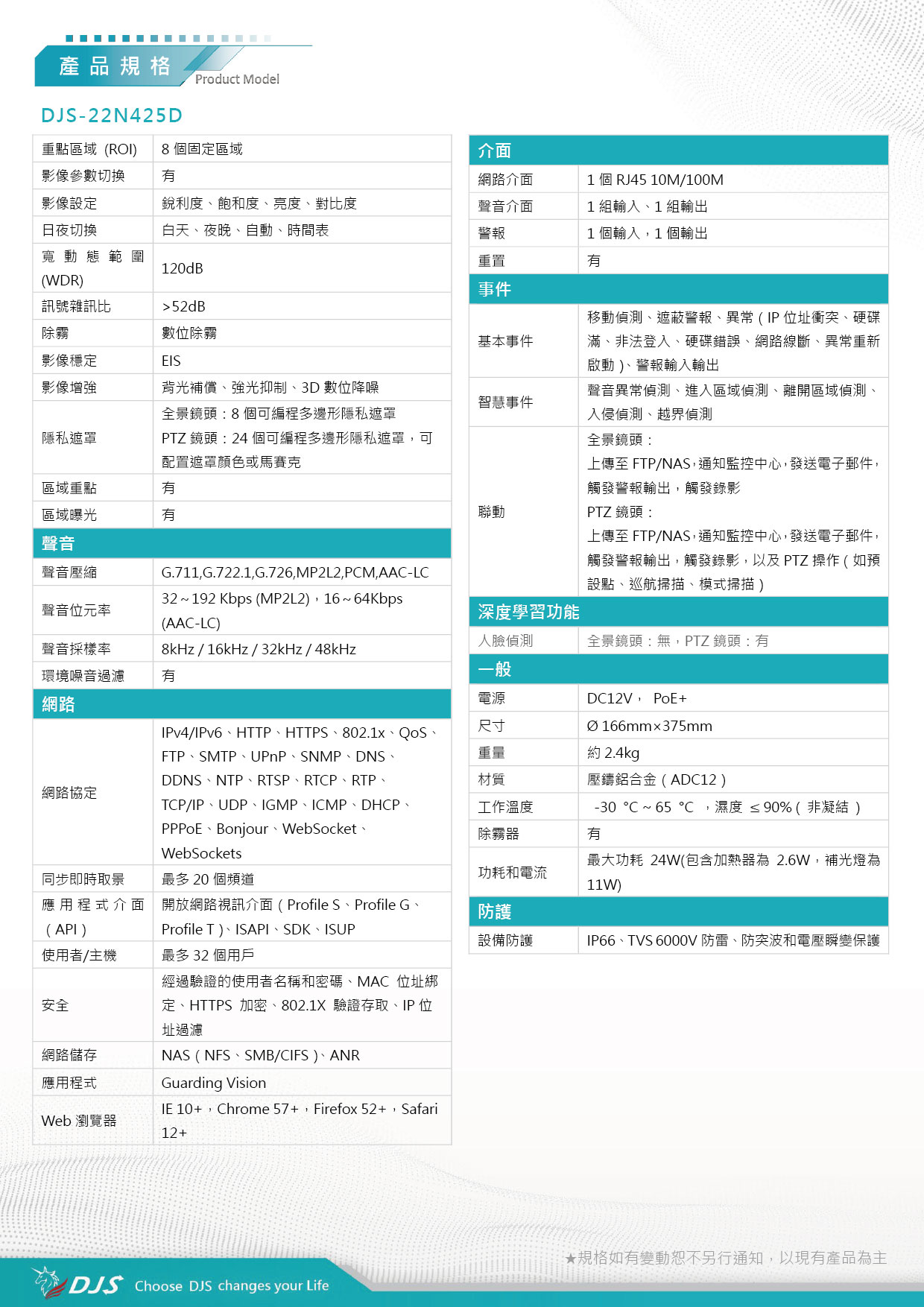 | 應用程式介面 | 開放網路視訊介面(Profile S、Profile G、Profile T)、ISAPI、SDK、ISUP | |||