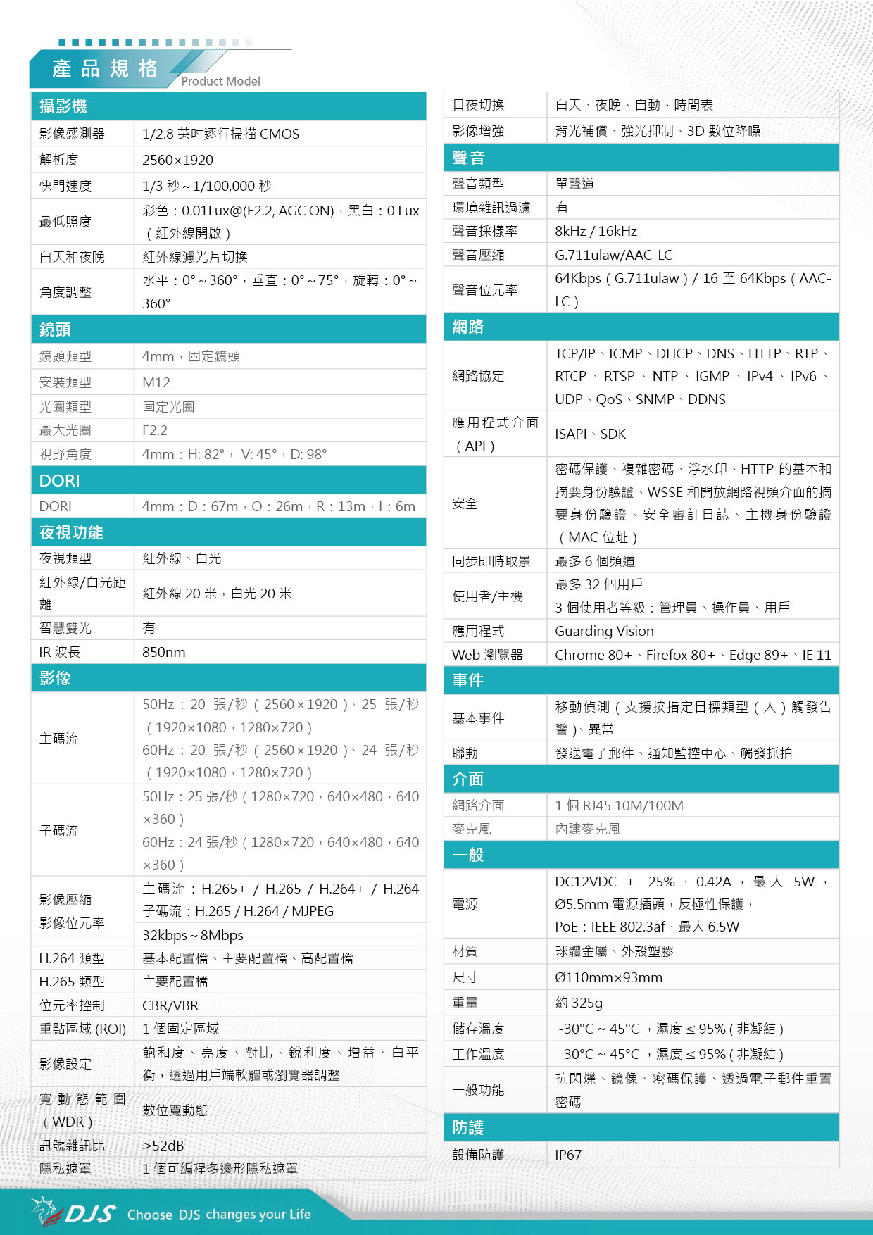 | 影像設定 | 飽和度、亮度、對比、銳利度、增益、白平衡,透過用戶端軟體或瀏覽器調整 | |||