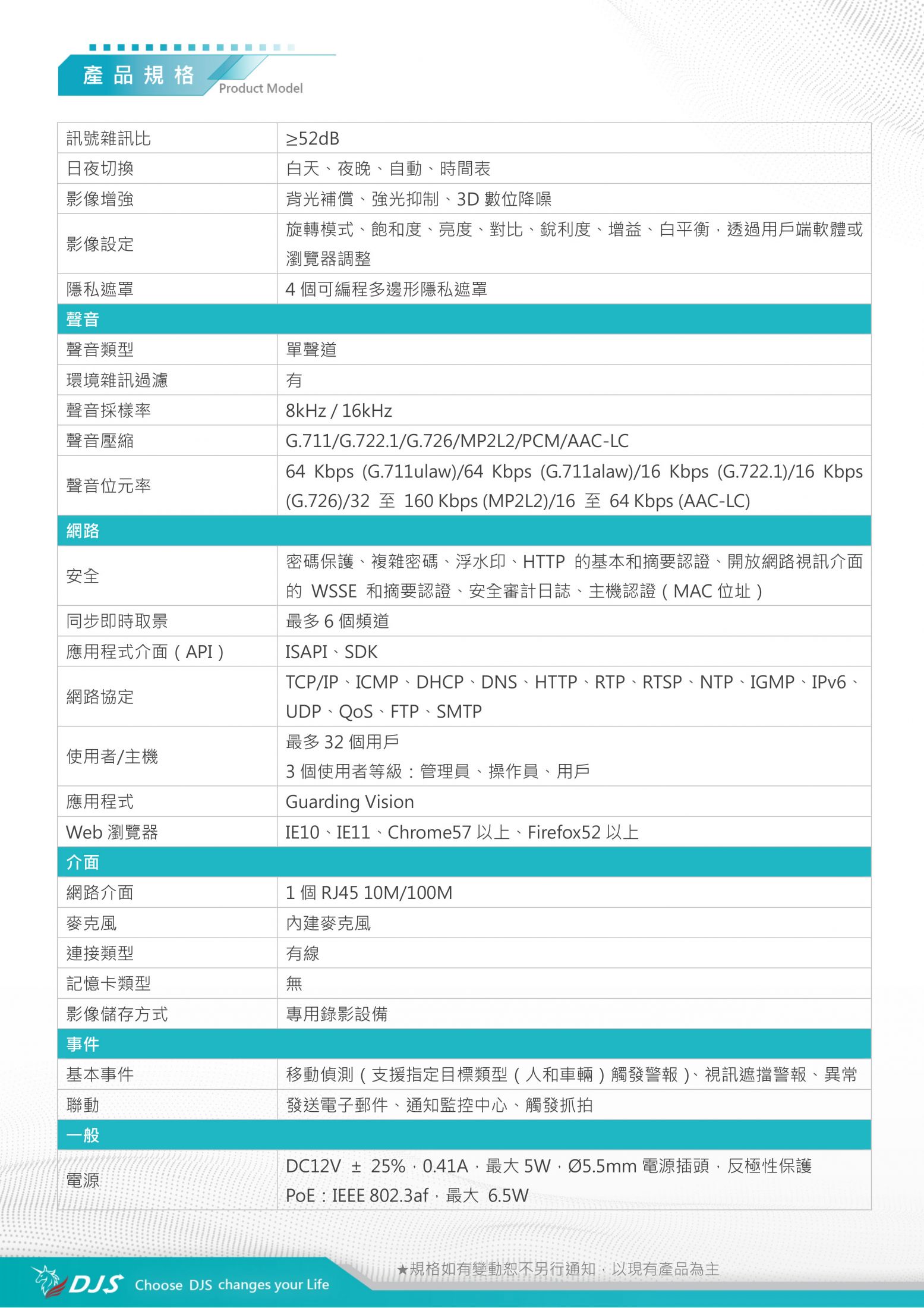 | 安全 | 密碼保護、複雜密碼、浮水印、HTTP 的基本和摘要認證、開放網路視訊介面的 WSSE 和摘要認證、安全審計日誌、主機認證(MAC位址) | |||