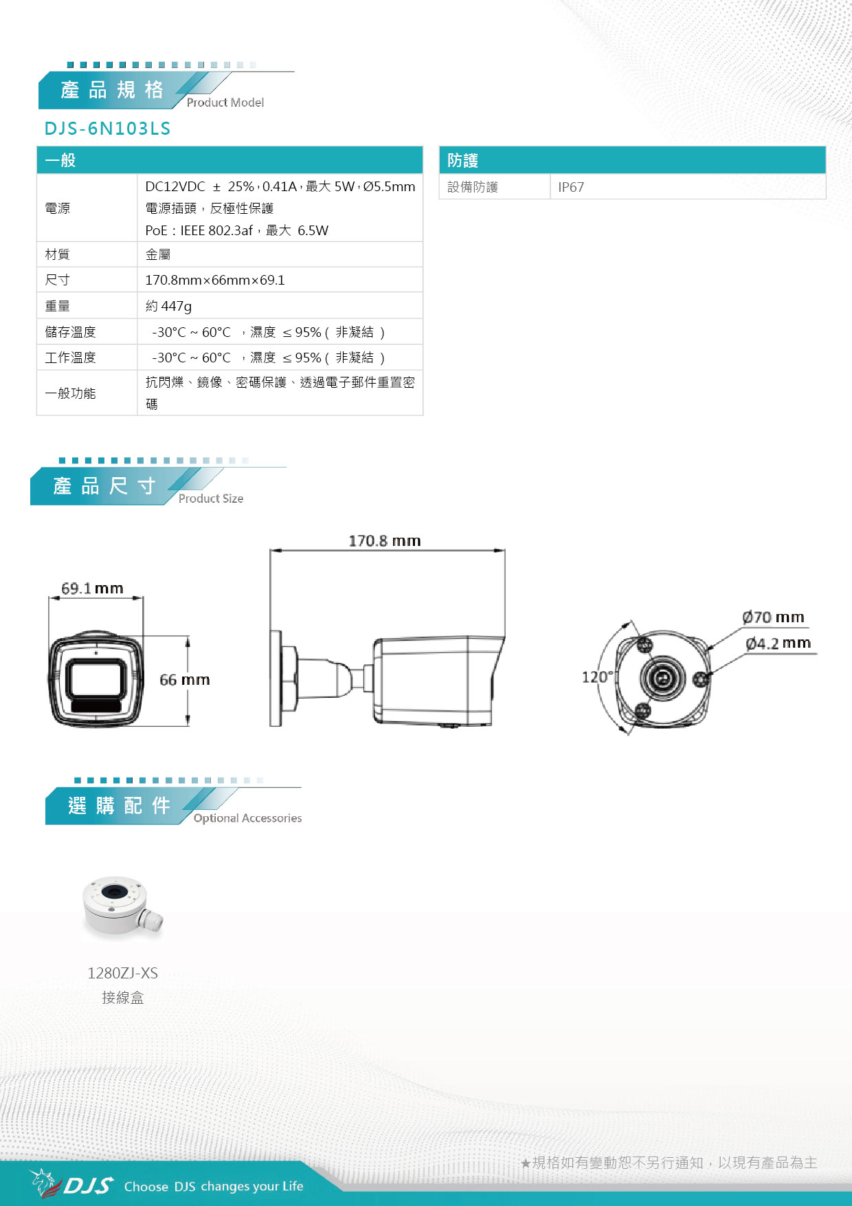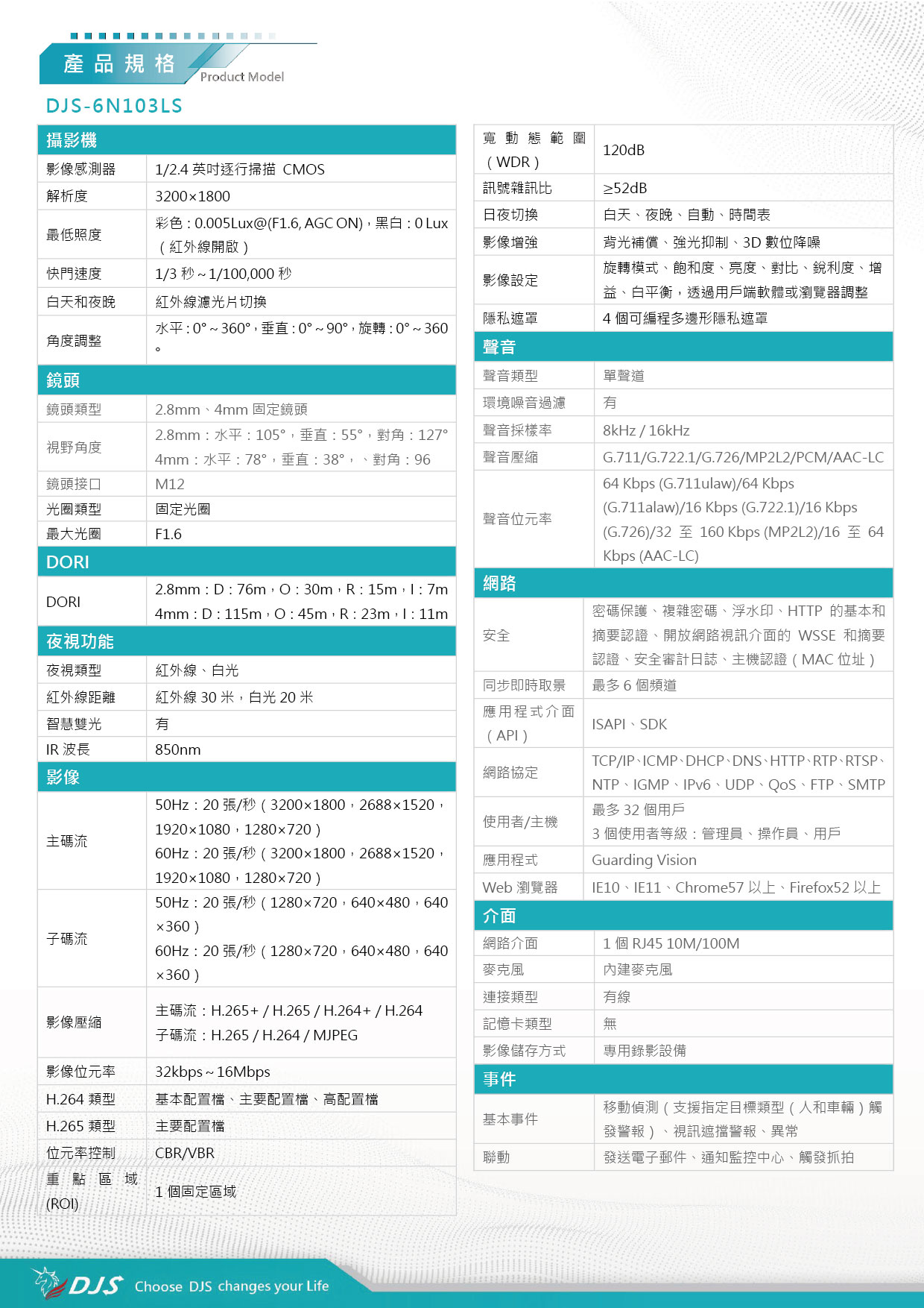 | 最低照度 | 彩色:0.005Lux@(F1.6, AGC ON),黑白:0 Lux(紅外線開啟) | |||