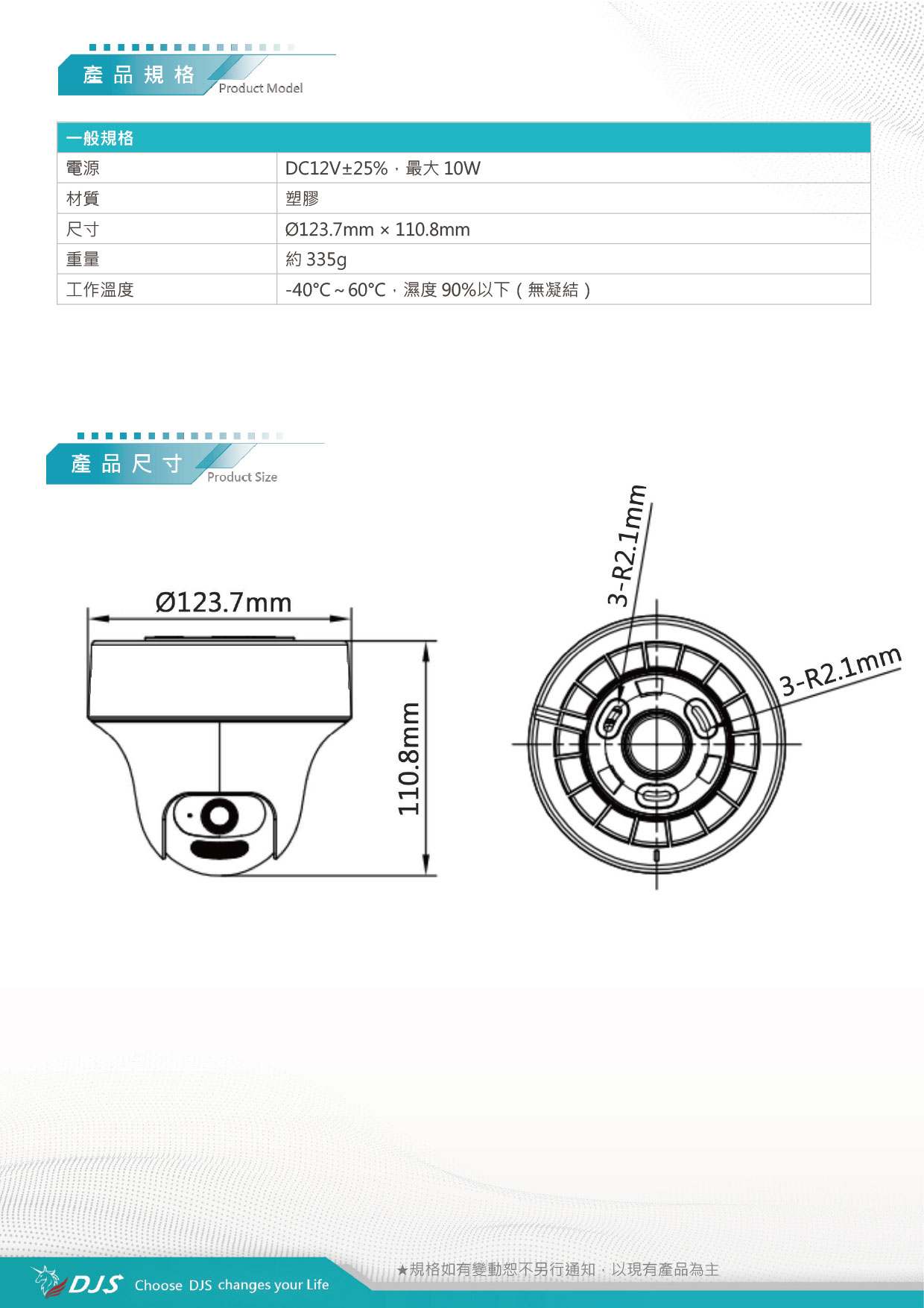 | 電源 | DC12V±25%,最大10W | |||