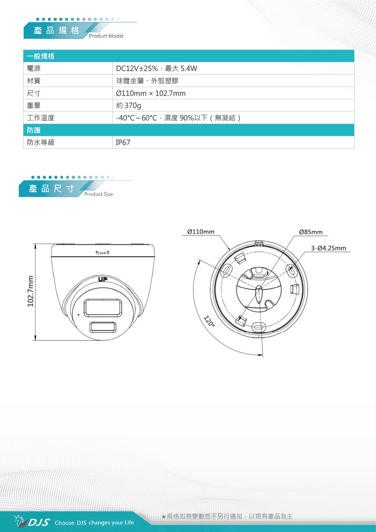 | 角度調整 | 水平: 0 °~ 360 °,垂直: 0 °~ 75 °,旋轉: 0 °~ 360 ° | |||