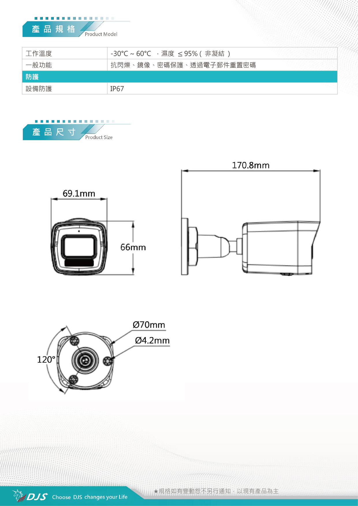 | 角度調整 | 水平:0°~360°,垂直:0°~90°,旋轉:0°~360° | |||