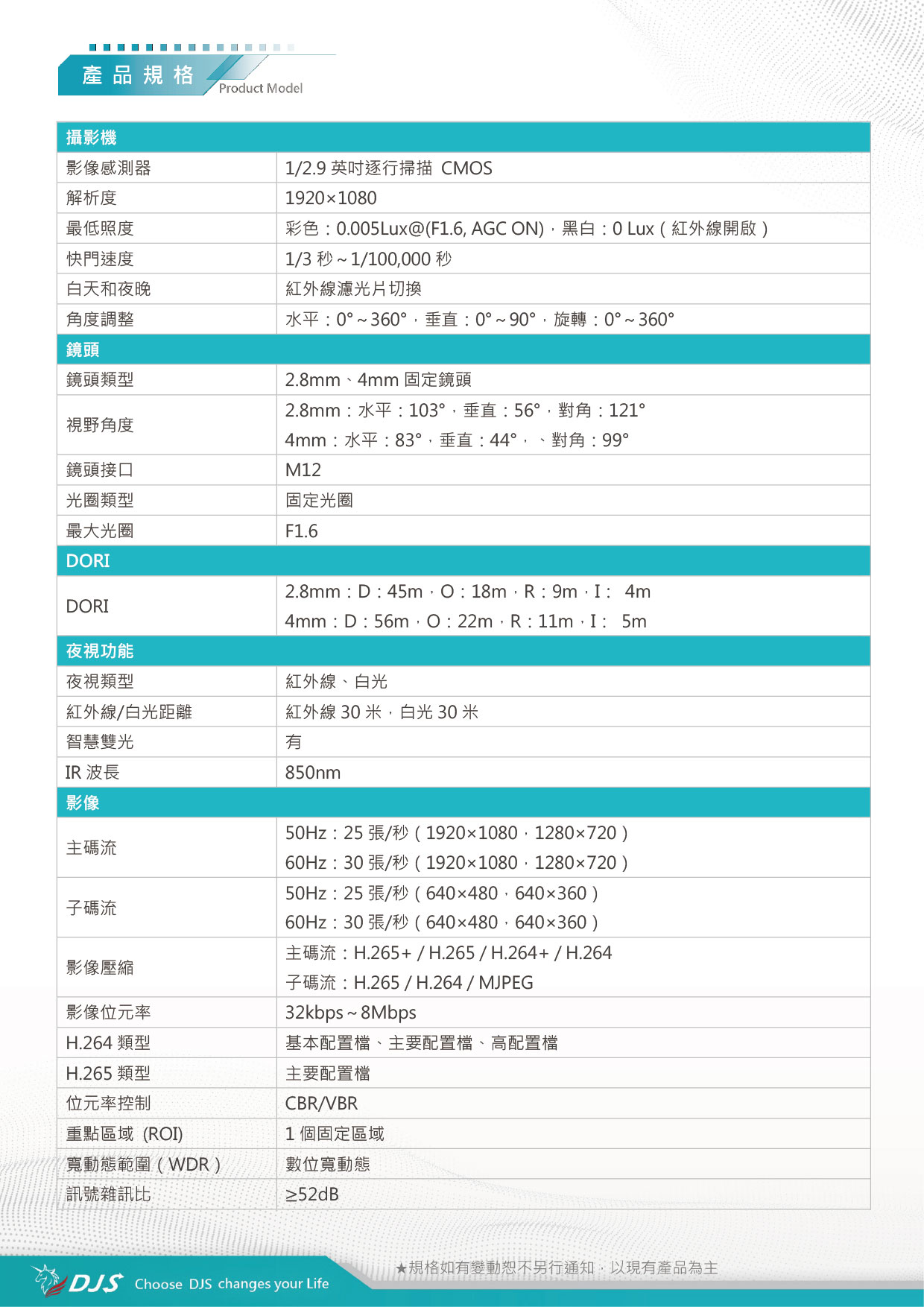 | 視野角度 | 2.8mm:水平:103°,垂直:56°,對角:121° | |||