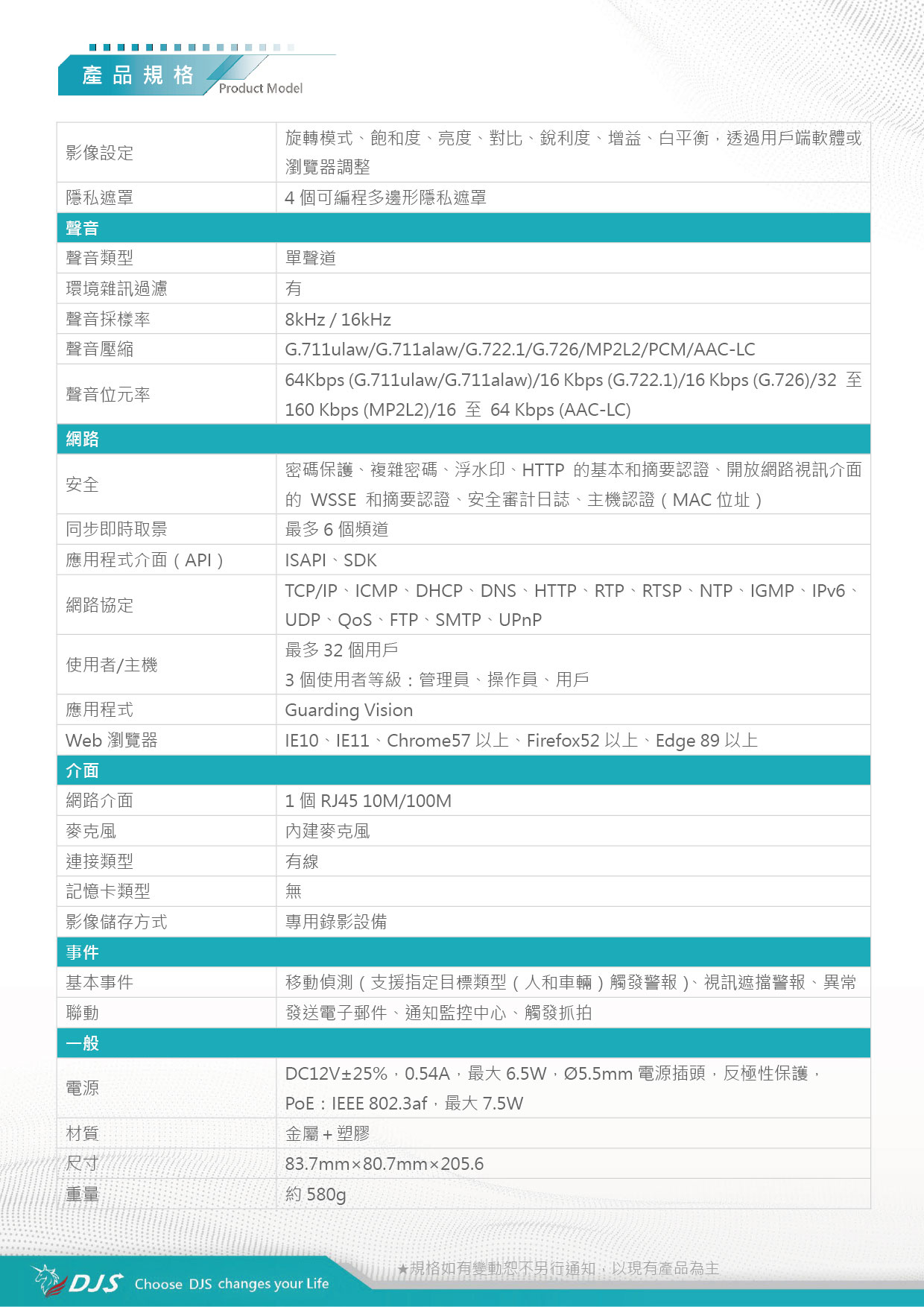 | 安全 | 密碼保護、複雜密碼、浮水印、HTTP 的基本和摘要認證、開放網路視訊介面的 WSSE 和摘要認證、安全審計日誌、主機認證(MAC位址) | |||