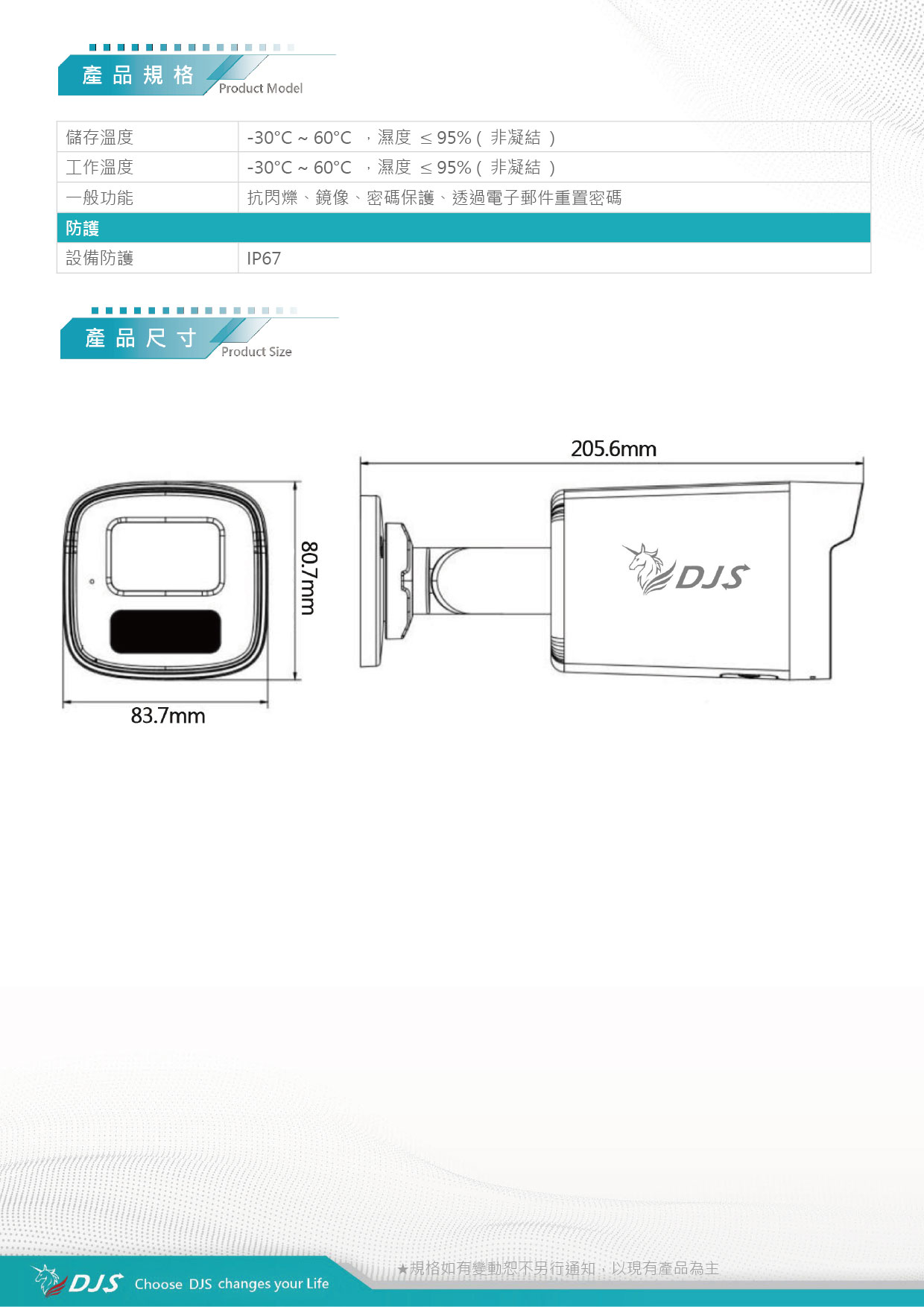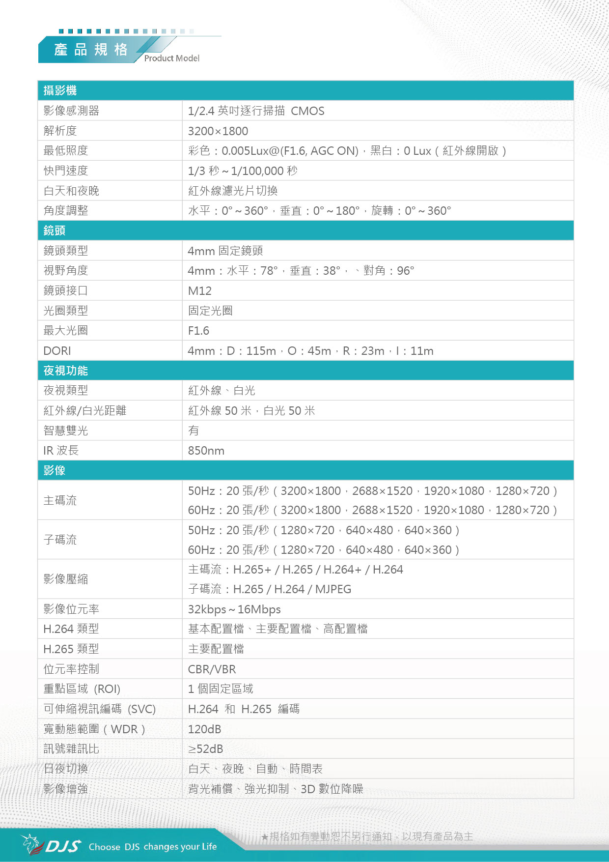 | 最低照度 | 彩色:0.005Lux@(F1.6, AGC ON),黑白:0 Lux(紅外線開啟) | |||