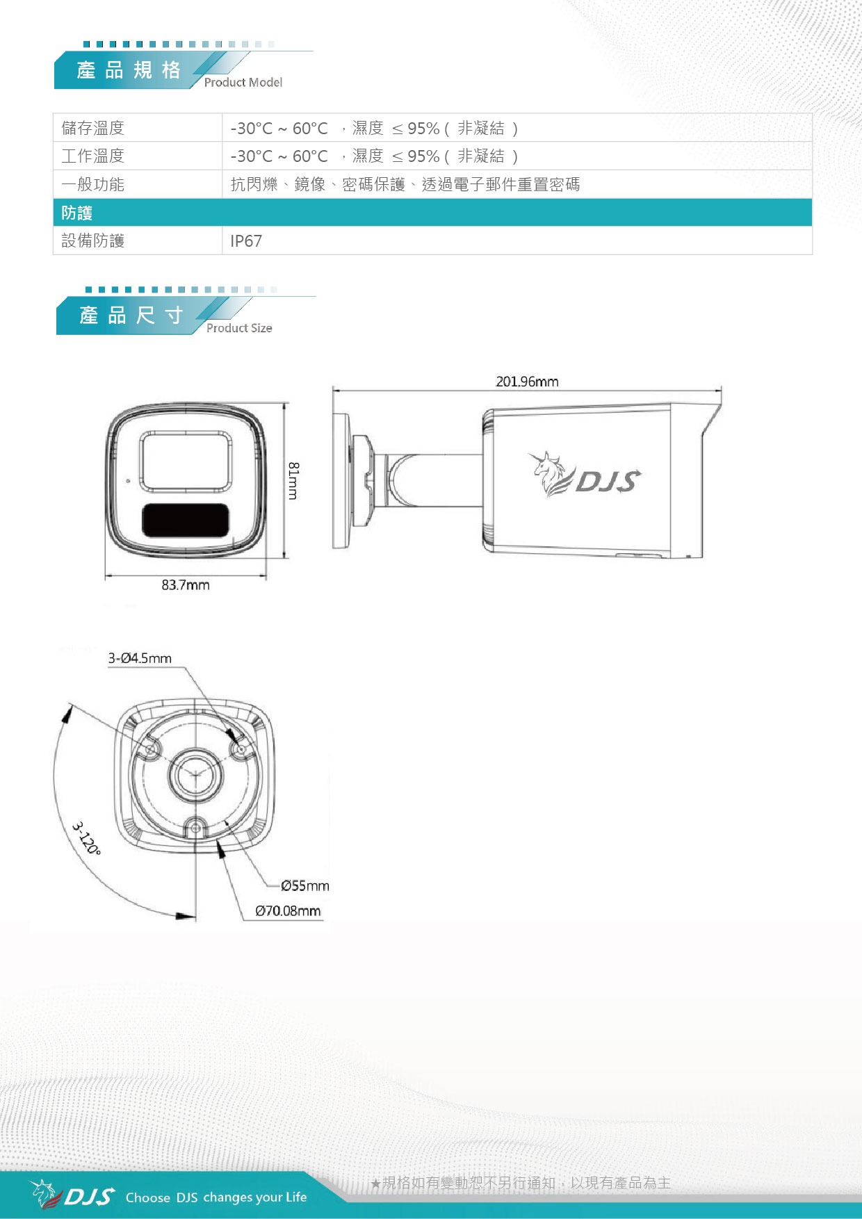 | 影像增強 | 背光補償、強光抑制、3D數位降噪 | |||