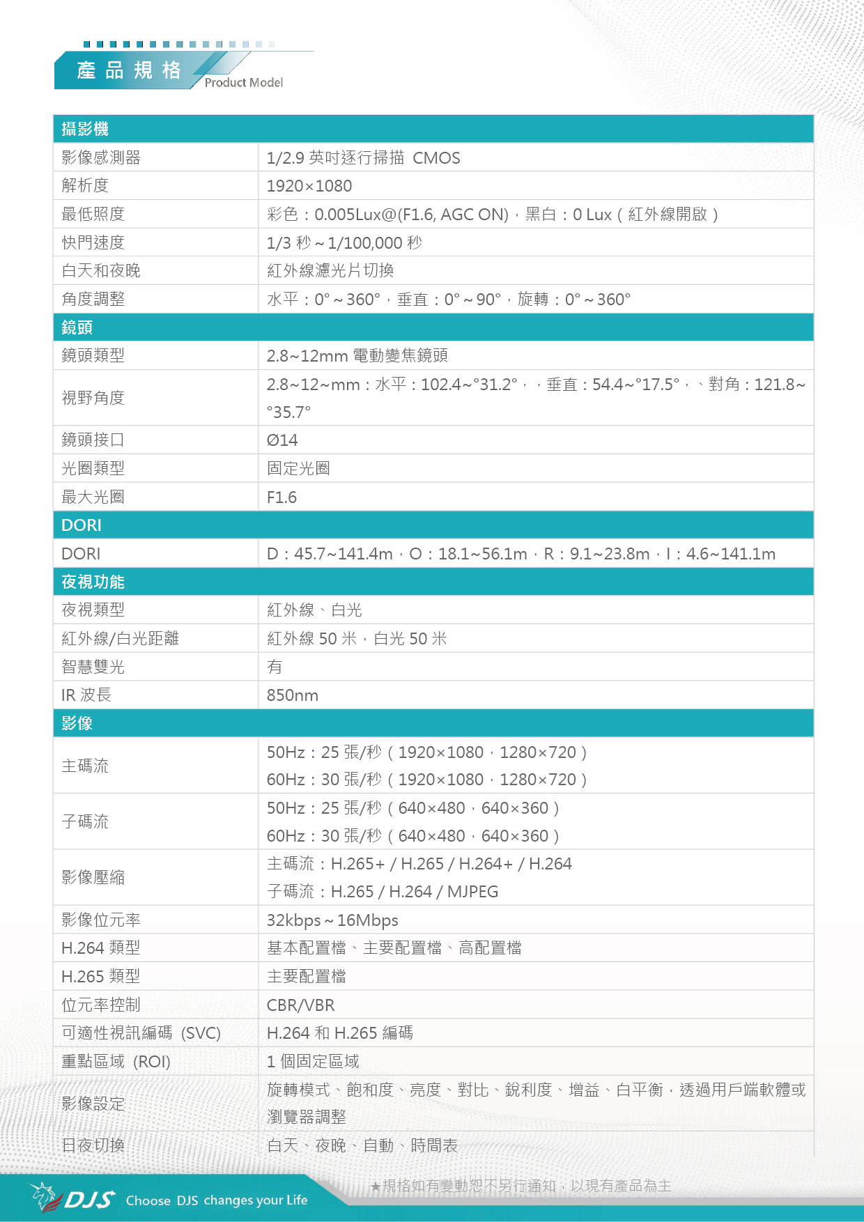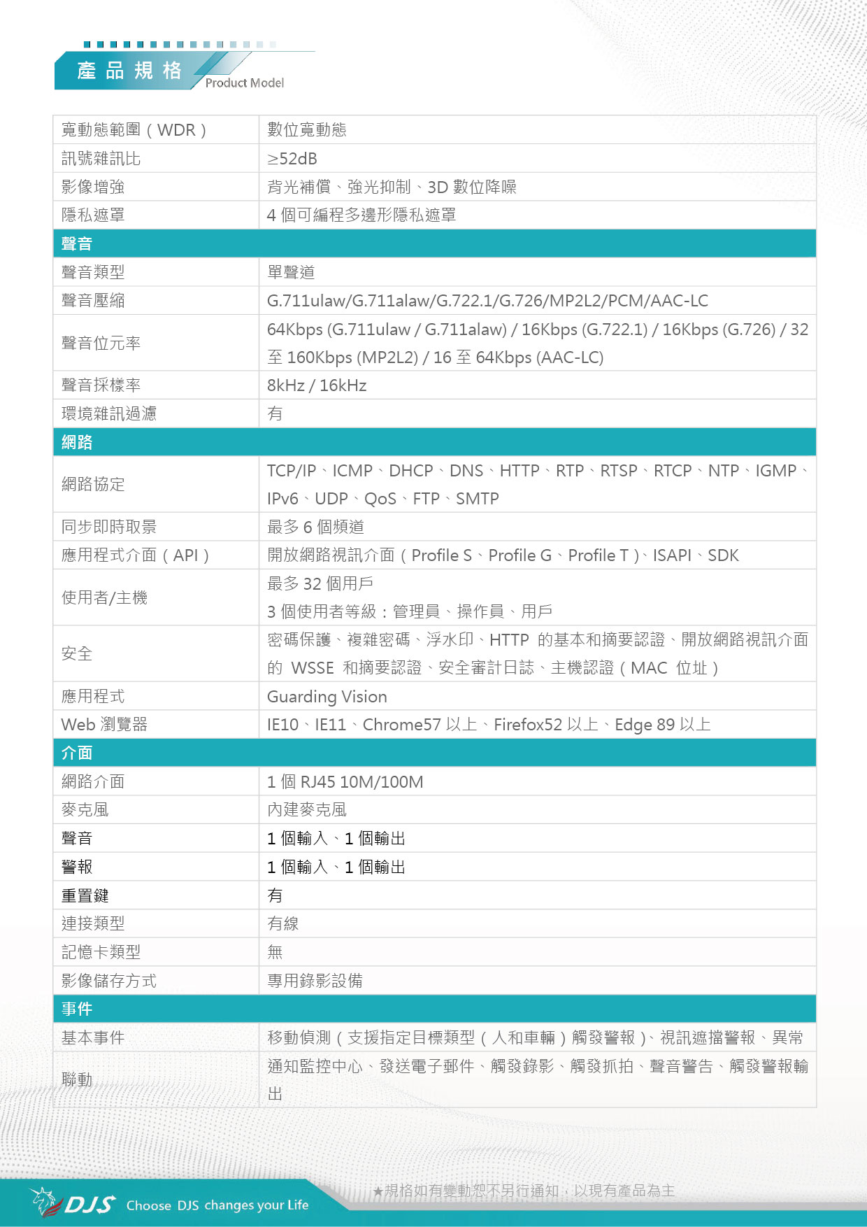 | 應用程式介面(API) | 開放網路視訊介面(Profile S、Profile G、Profile T)、ISAPI、SDK | |||