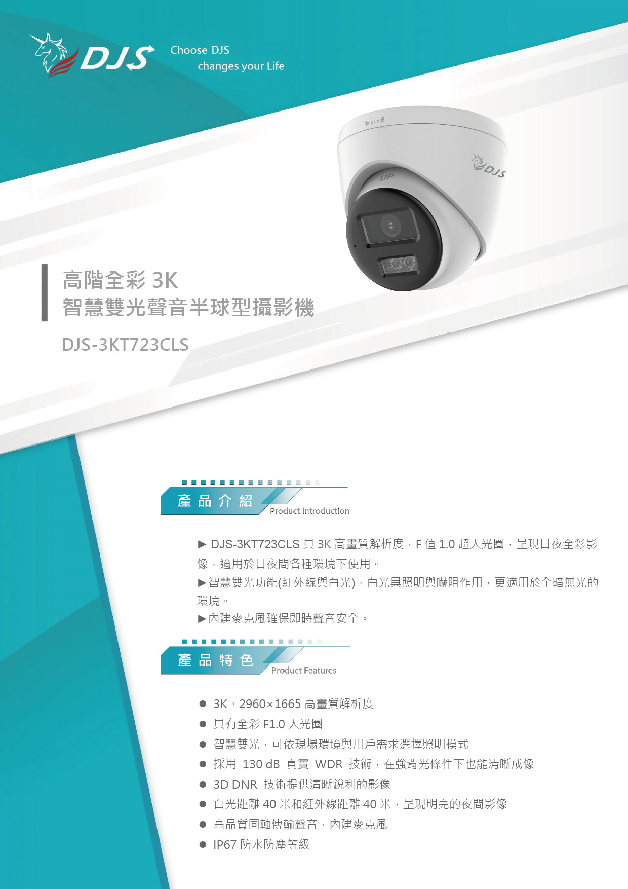 高階全彩3K智慧雙光聲音半球型攝影機
