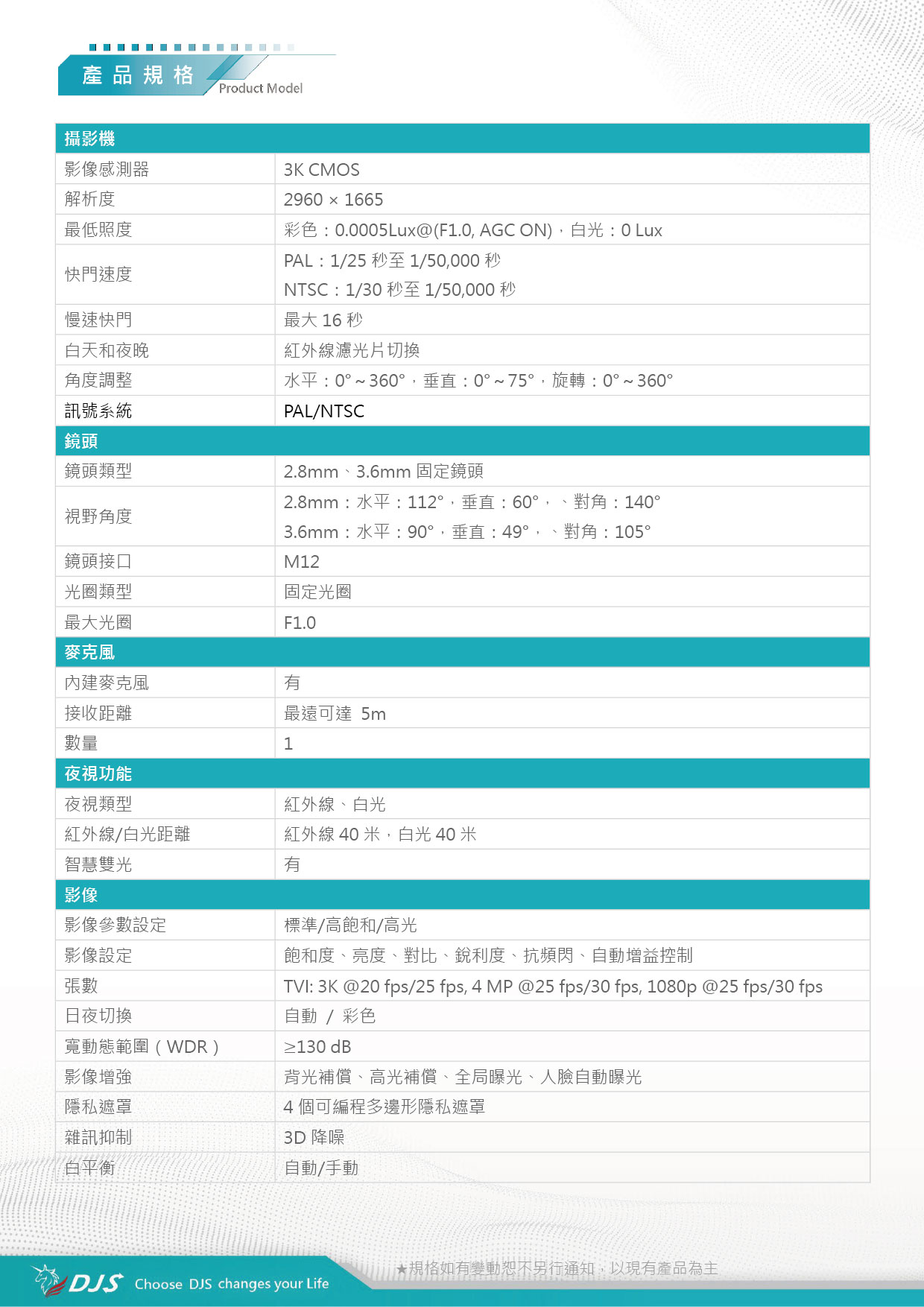 | 鏡頭類型 | 2.8mm 、 3.6mm 固定鏡頭 | |||