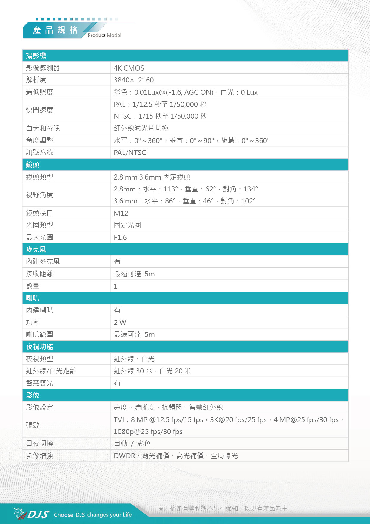 | 鏡頭類型 | 2.8mm、3.6mm固定鏡頭 | |||
