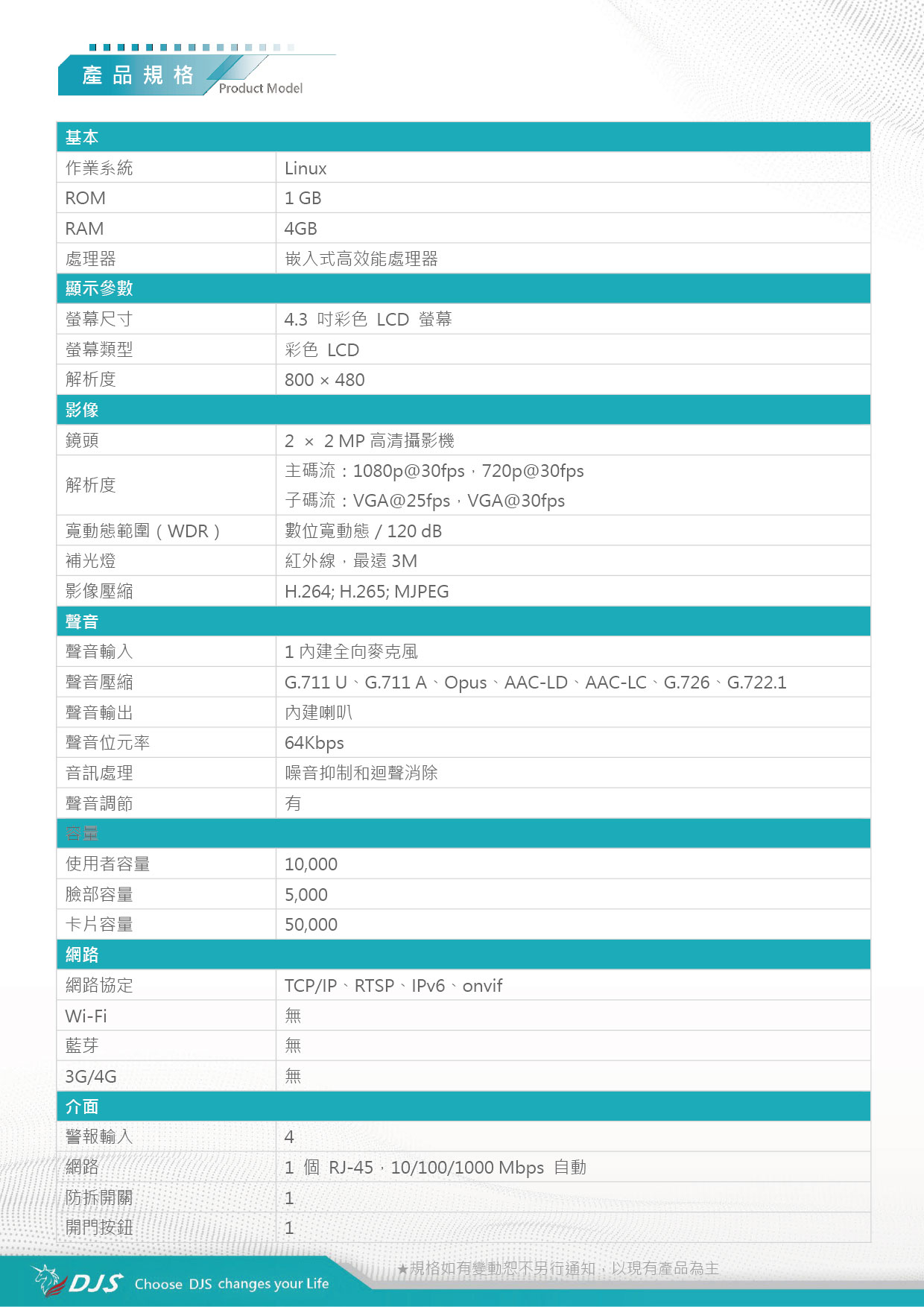 | 聲音壓縮 | G.711 U、G.711 A、Opus、AAC-LD、AAC-LC、G.726、G.722.1 | |||