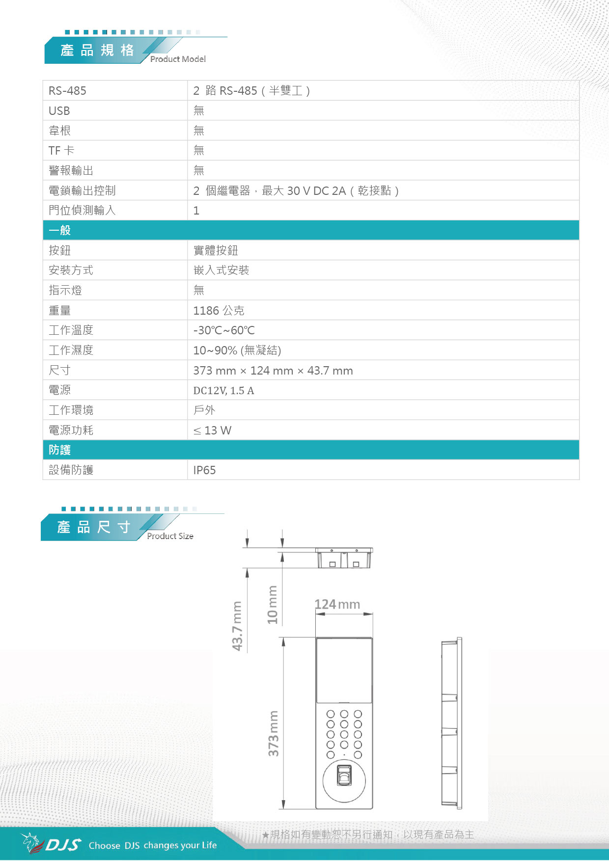 | 電鎖輸出控制 | 2 個繼電器,最大30 V DC 2A(乾接點) | |||