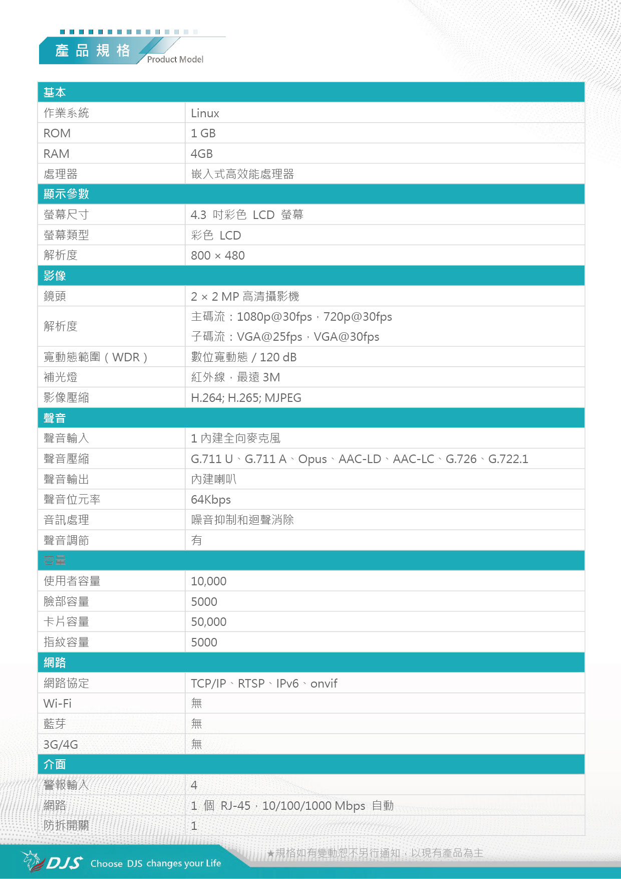| 聲音壓縮 | G.711 U、G.711 A、Opus、AAC-LD、AAC-LC、G.726、G.722.1 | |||