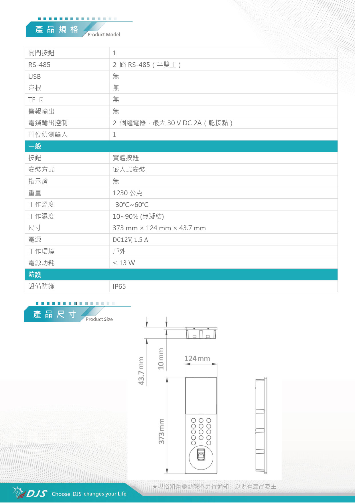 | 電鎖輸出控制 | 2 個繼電器,最大30 V DC 2A(乾接點) | |||