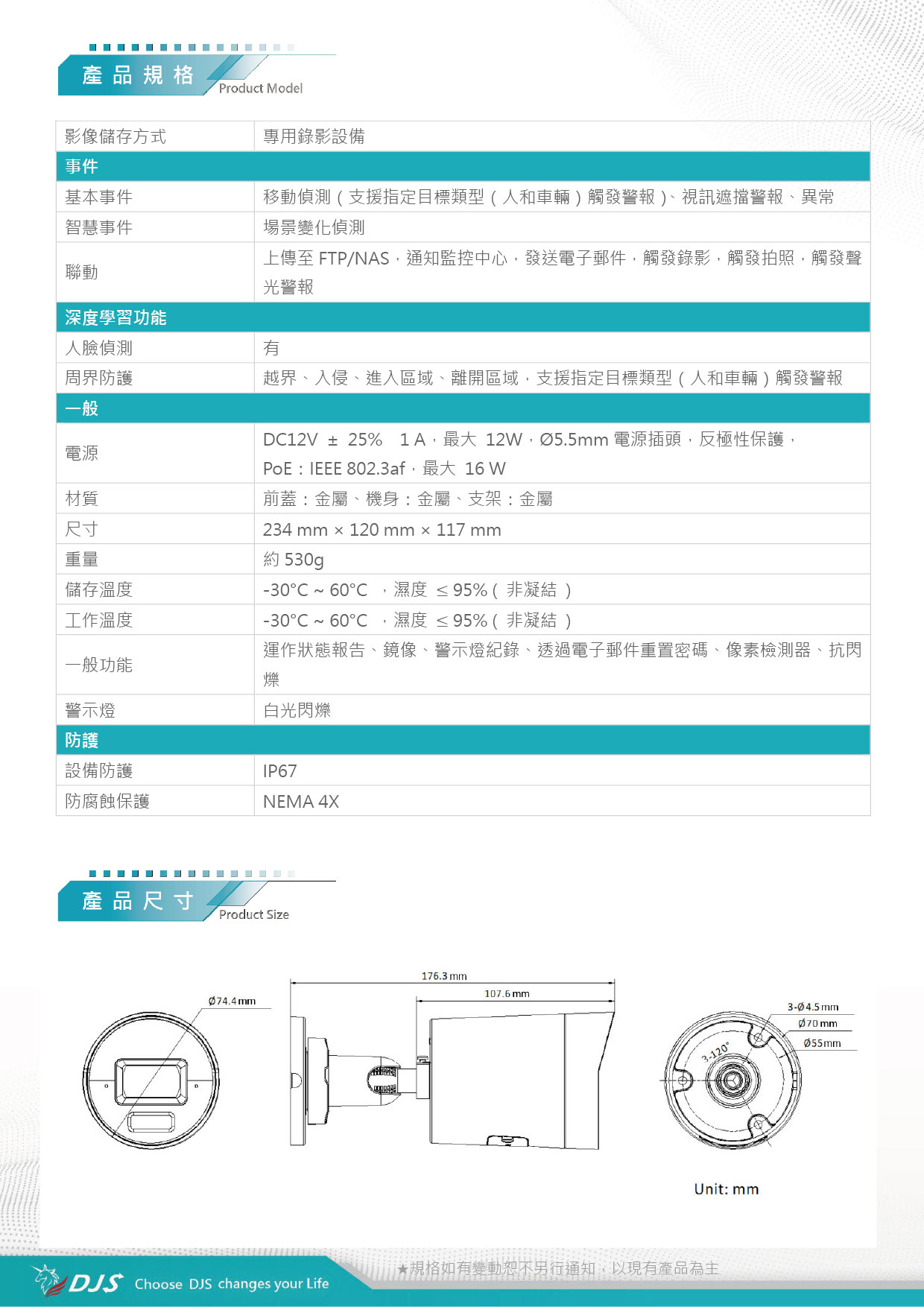 | 影像設定 | 旋轉模式、飽和度、亮度、對比、銳利度、增益、白平衡,透過用戶端軟體或瀏覽器調整 | |||
