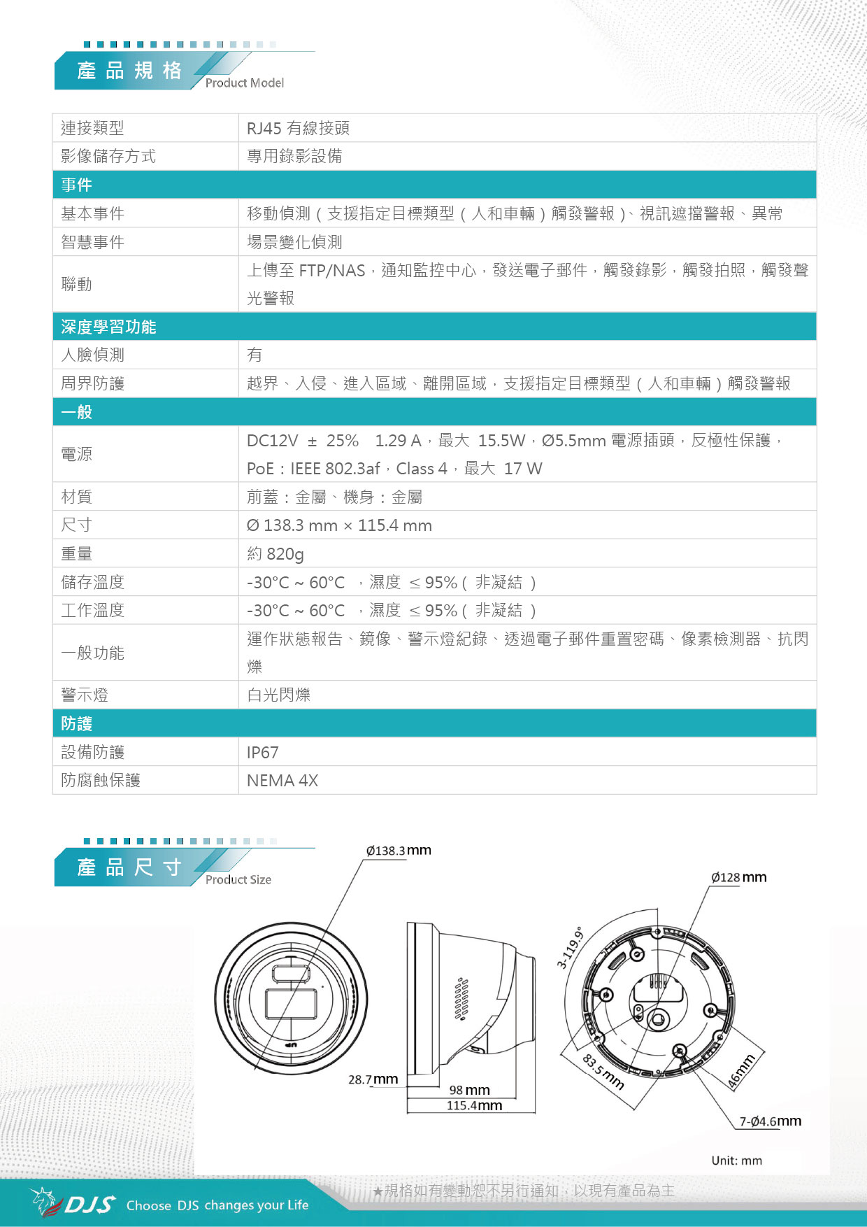 | 基本事件 | 移動偵測(支援指定目標類型(人和車輛)觸發警報)、視訊遮擋警報、異常 | |||