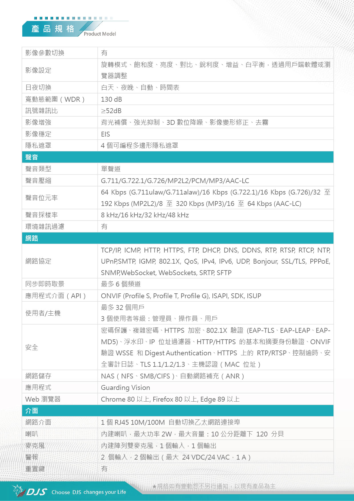 | 影像設定 | 旋轉模式、飽和度、亮度、對比、銳利度、增益、白平衡,透過用戶端軟體或瀏覽器調整 | |||