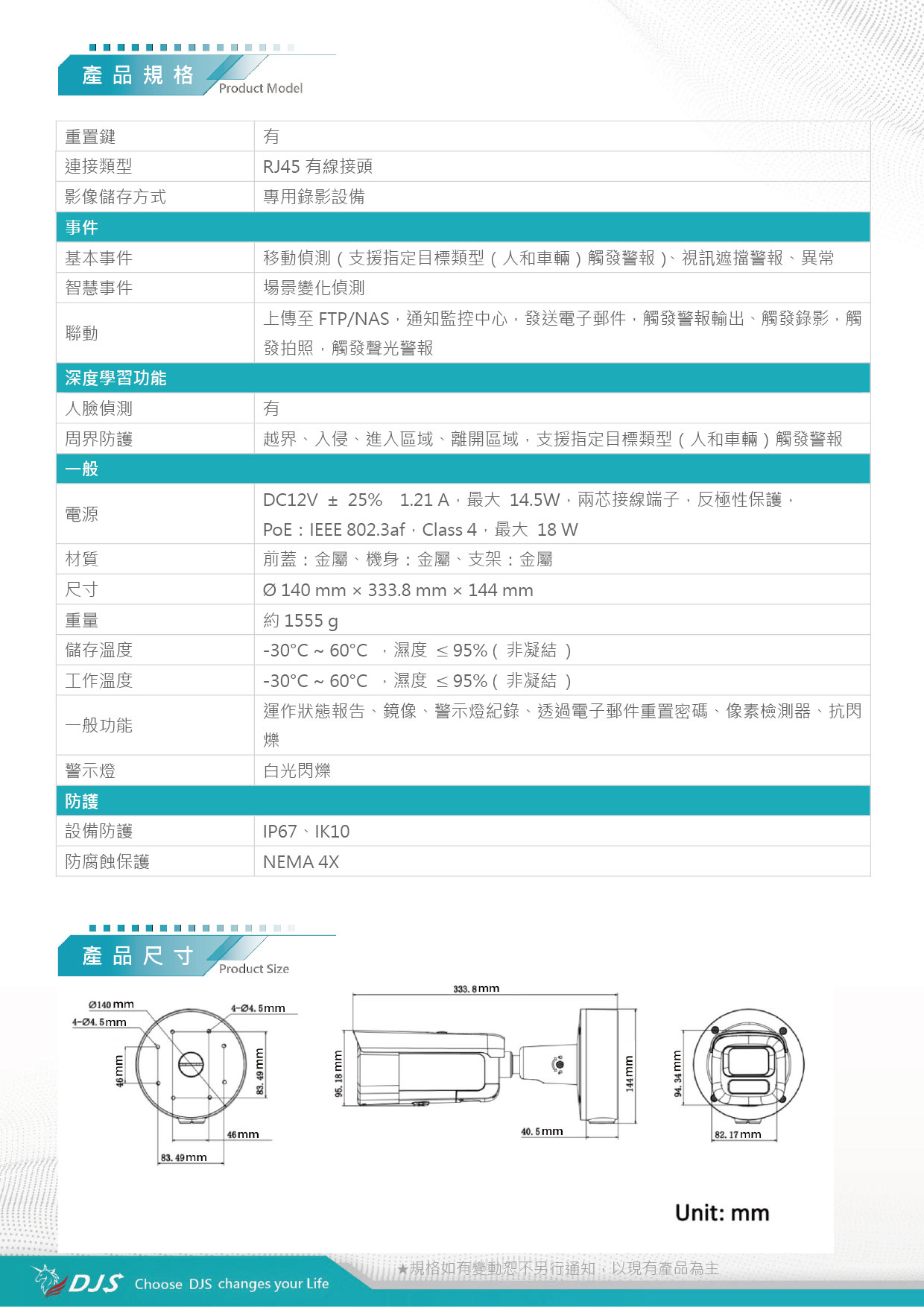 | 影像增強 | 背光補償、強光抑制、3D數位降噪、影像變形修正、去霧 | |||