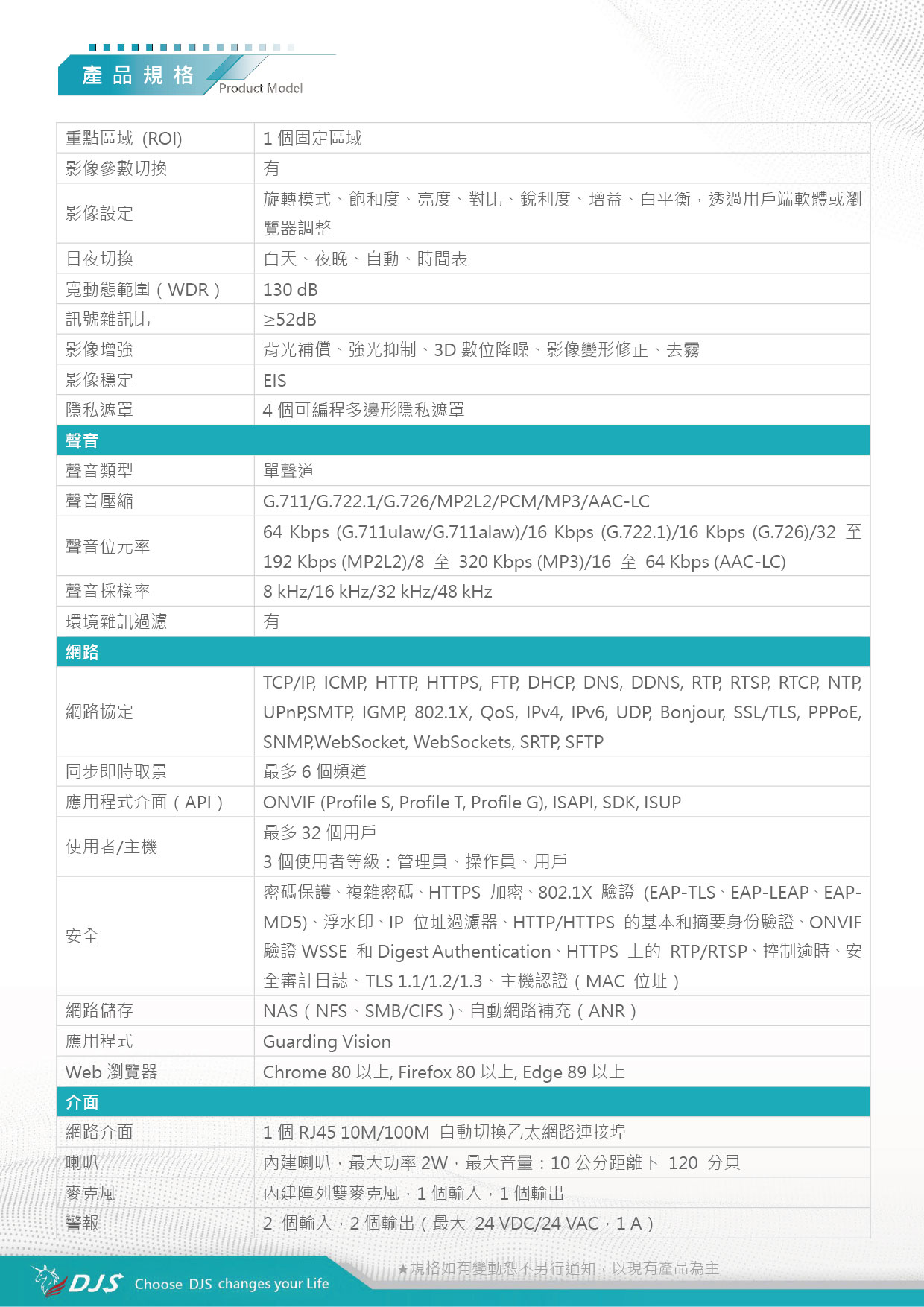 | 應用程式介面 | ONVIF (Profile S, Profile T, Profile G), ISAPI, SDK, ISUP | |||