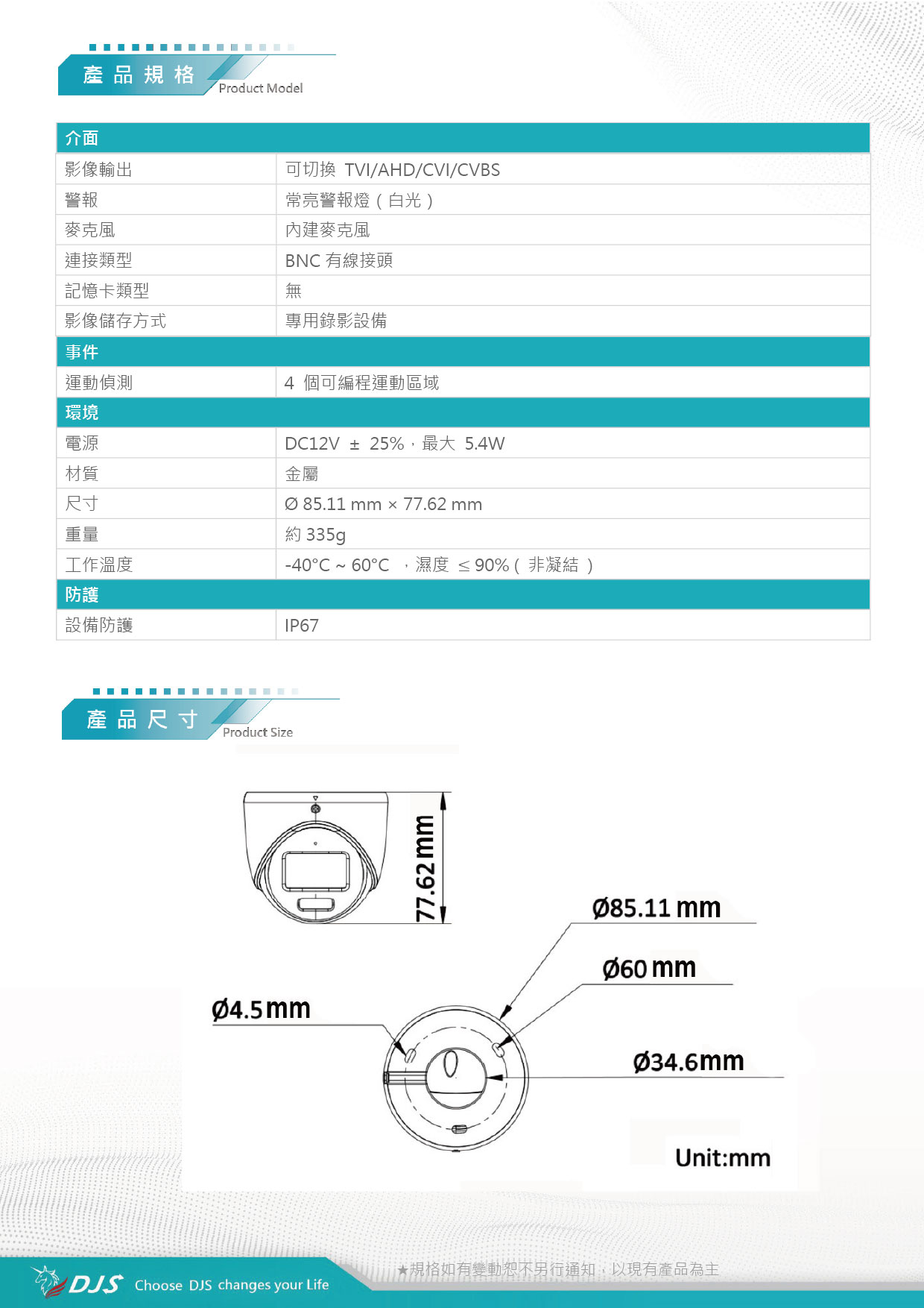 | 影像輸出 | 可切換 TVI/AHD/CVI/CVBS | |||