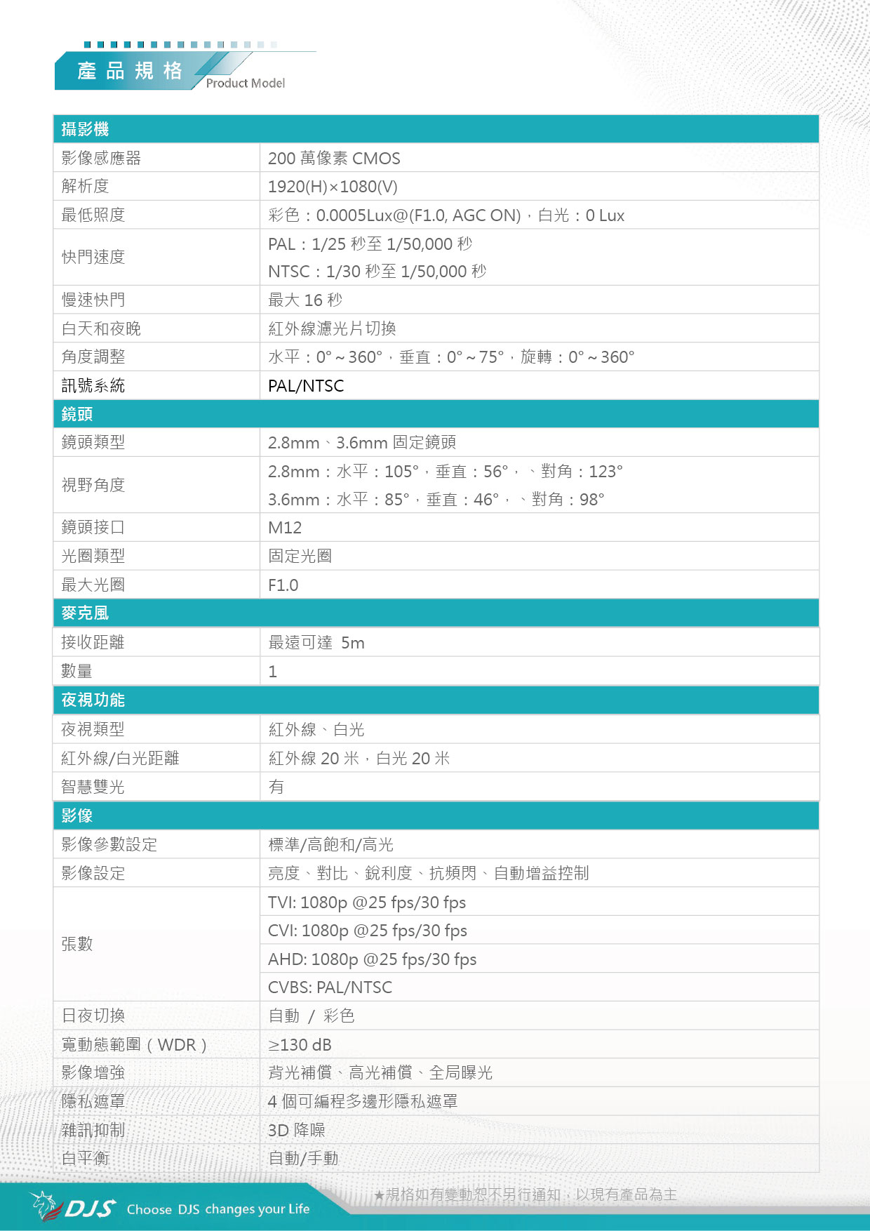 | 鏡頭類型 | 2.8mm、3.6mm固定鏡頭 | |||