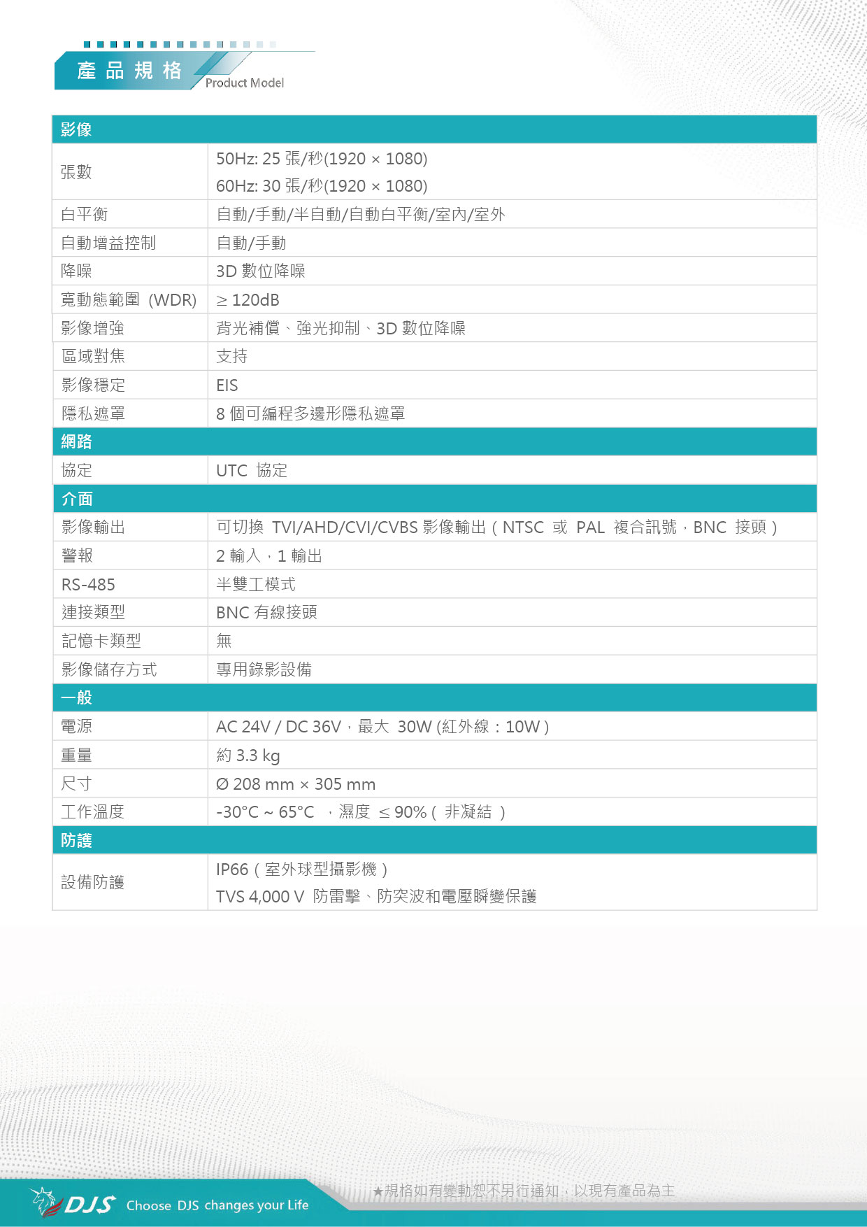 | 影像輸出 | 可切換 TVI/AHD/CVI/CVBS影像輸出(NTSC 或 PAL 複合訊號,BNC 接頭) | |||