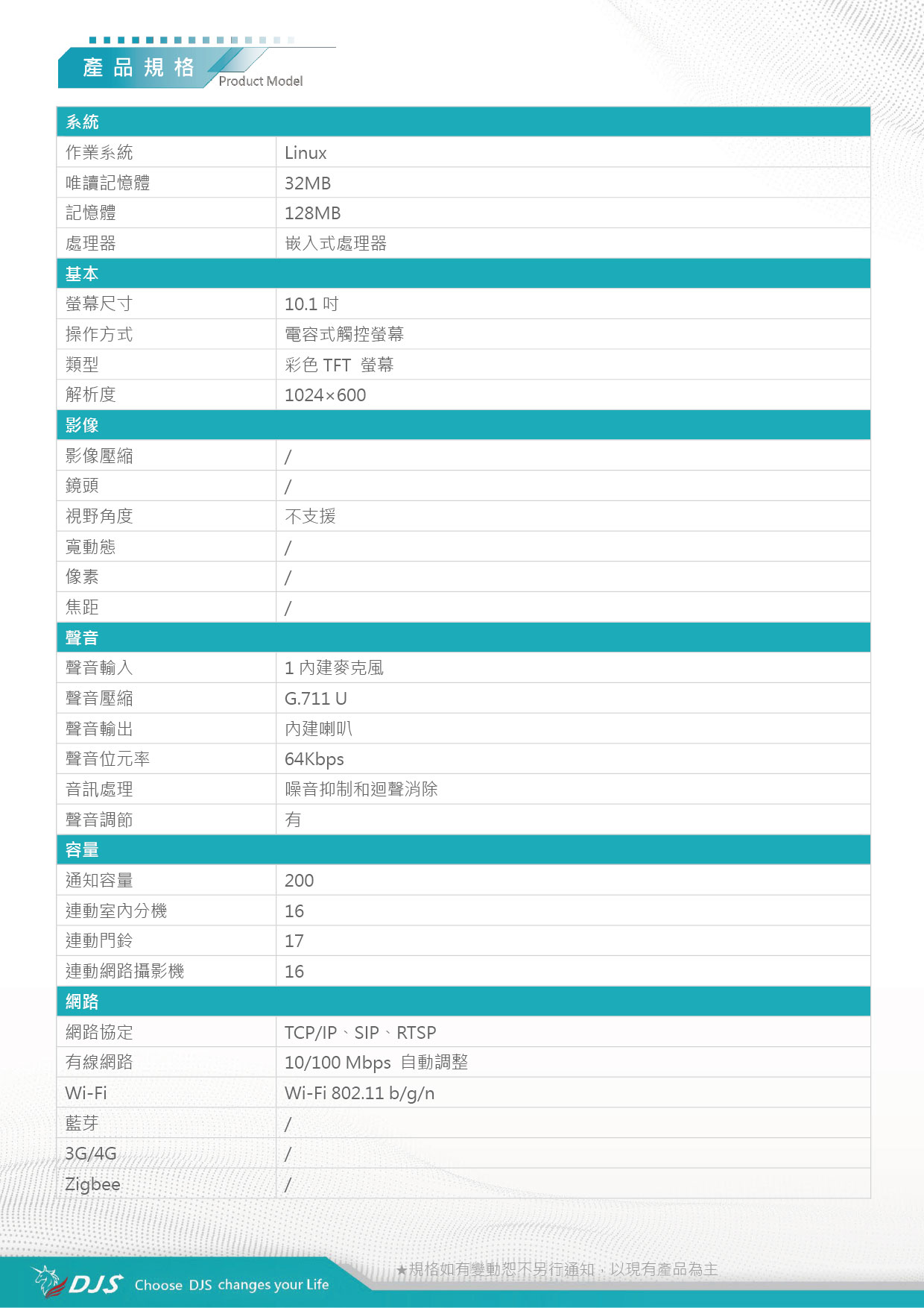 | 網路協定 | TCP/IP 、 SIP 、 RTSP | |||